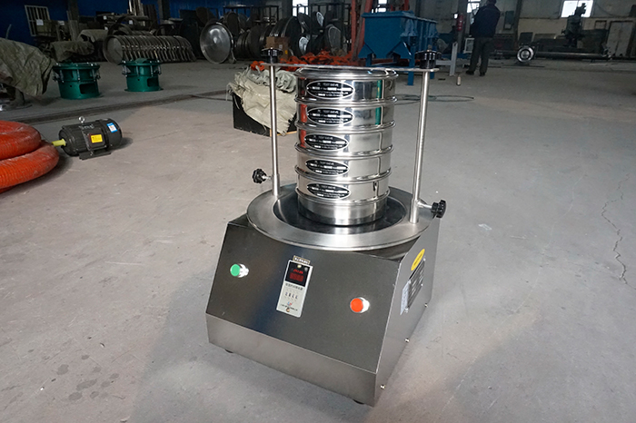 試驗(yàn)篩機(jī)是以YZU立式振動電機(jī)作為整機(jī)振動源,通過振動電機(jī)帶動上部振動盤振動,再通過振動盤傳導(dǎo)至安放在振動盤上部Φ200篩框上,然后由需要檢測目數(shù)的篩框把小于篩網(wǎng)孔徑的物料顆粒篩分至下層篩框,如此層層篩選,使每層試驗(yàn)篩內(nèi)只留相同粒度的物料,達(dá)到不同粒度的分離并確定此物料的粒度組成,使Φ200型篩框中的物料能非常有效的起到過濾、分級、篩分目的。